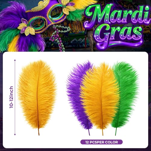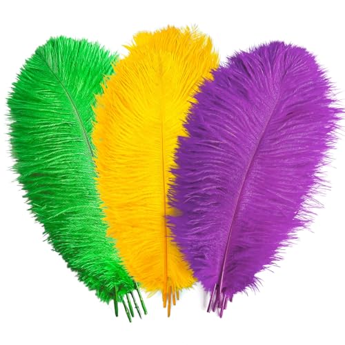 Specification: Piokio 36 pcs Mardi Gras Ostrich Feathers 10-12 inch(25-30 cm) Bulk for Mardi Gras DIY Clothing and Accessories Masquerade Party Decorations Table Centerpiece(Gold Green Purple)