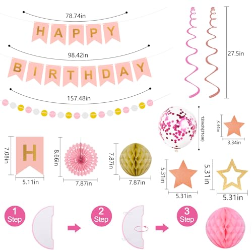 Specification: 65Pcs Birthday Decorations Happy Birthday Banner Pink Rose Gold Balloons Honeycomb Ball Paper Fans Dots Garland Hanging Swirls Birthday Party Decor for Girls Women Princess