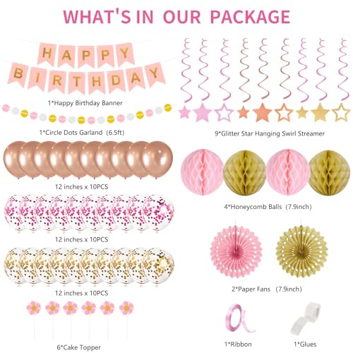💗Birthday Decorations for Women and Girls: You will get a valuable package of “HAPPY BIRTHDAY” bannner,2 paper fans, 20 confetti balloons, 10 rose gold latex balloons, 4 honeycomb balls, 1pcs Circle Dots Decorations, 9 Stars Hanging Swirl Streamers, 6 cupcake toppers, 1pcs ribbon/ dot glue.