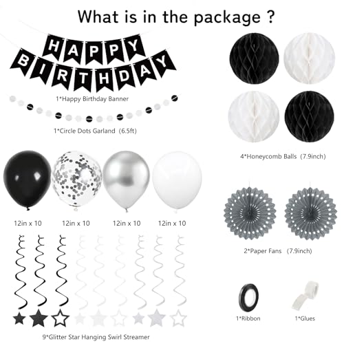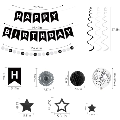 Specification: 69Pcs Birthday Decorations Black Happy Birthday Banner Balloons Paper Fans Honeycomb Balls Hanging Swirl Stars Garland Party Decorations for Men Women Wednesday Halloween