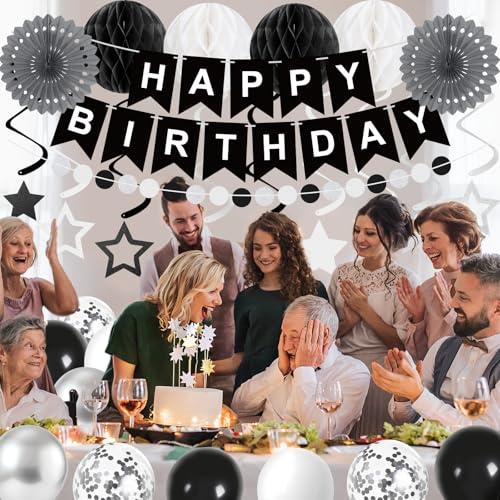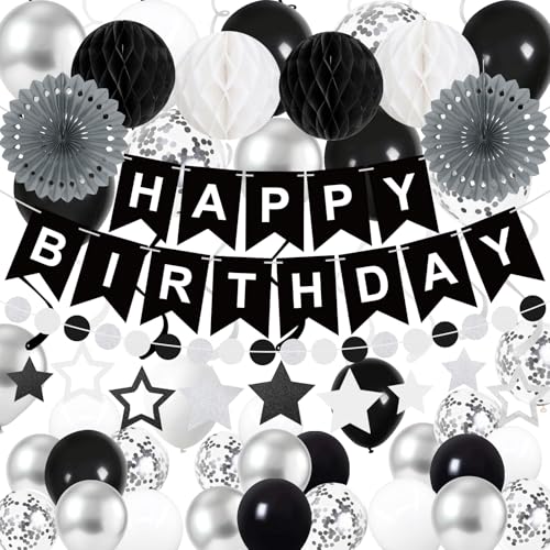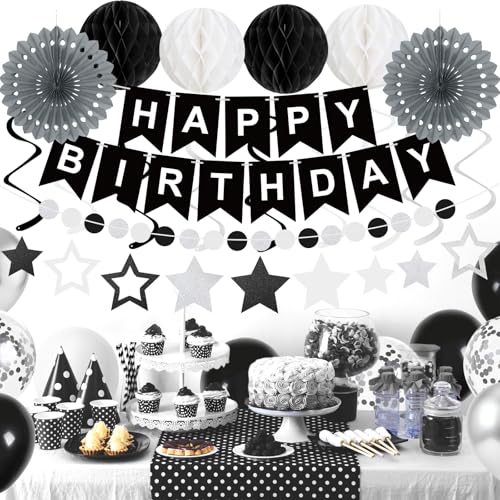 69Pcs Birthday Decorations Black Happy Birthday Banner Balloons Paper Fans Honeycomb Balls Hanging Swirl Stars Garland Party Decorations for Men Women Wednesday Halloween