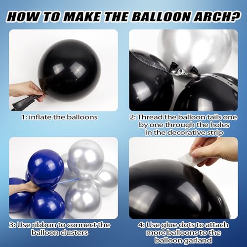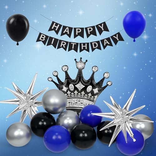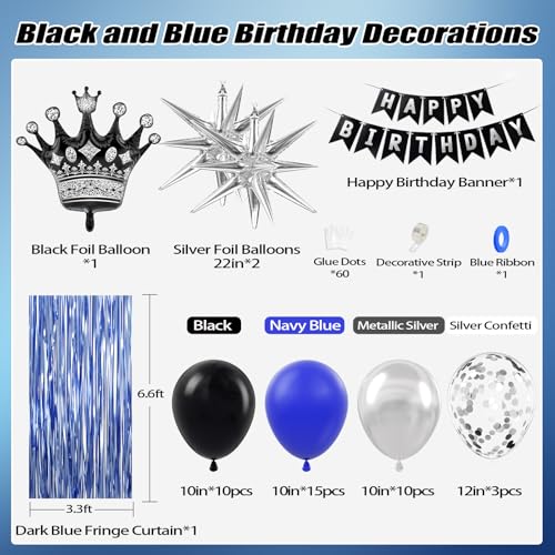 Package Included: The blue happy birthday decorations kit includes 10inch navy blue balloonsx15, 10inch black balloonsx10, 10inch metallic silver balloonsx10, 12inch silver confetti balloonsx3, happy birthday bannerx1, black foil balloonx1, 22inch silver foil balloonsx2, dark blue fringe curtainx1, glue dotsx60, ribbonx1, decorative stripx1