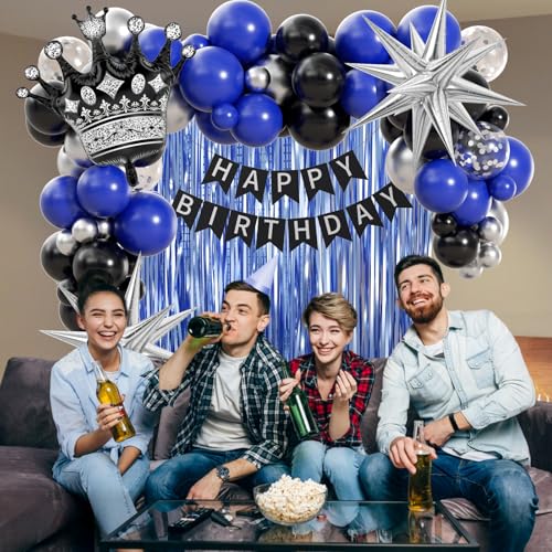 Specification: Birthday Decorations for Men with Black Metallic Silver Navy Blue Balloons Banner Blue Fringe Curtain for 21st 25th 27th 30th 35th 40th 50th 60th Men Birthday Decorations