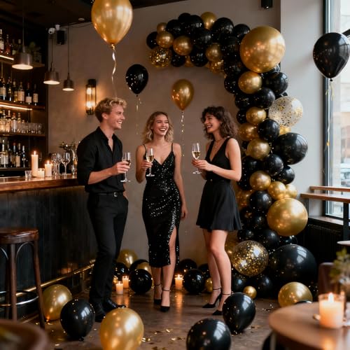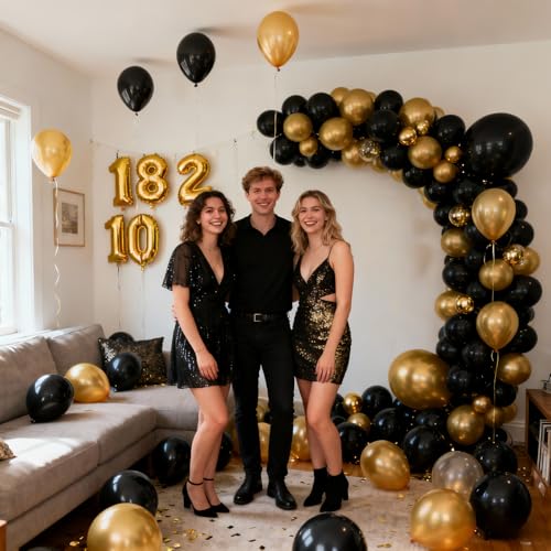 Black Gold Balloons, 145 Pieces Matte Black Balloon Metallic Chrome Gold Balloon for New Year, Birthday Party, Graduations
