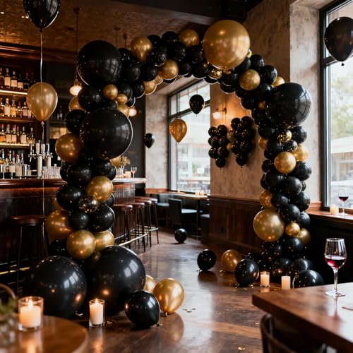 Specification: Black Gold Balloons, 145 Pieces Matte Black Balloon Metallic Chrome Gold Balloon for New Year, Birthday Party, Graduations