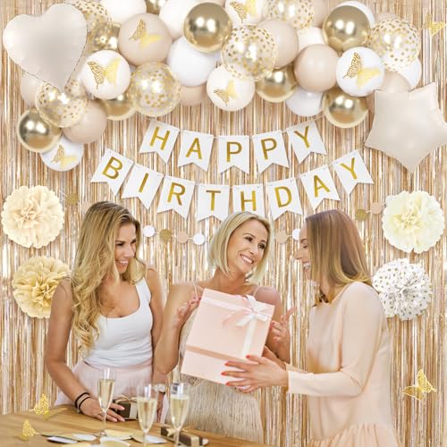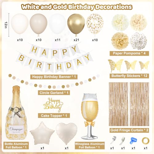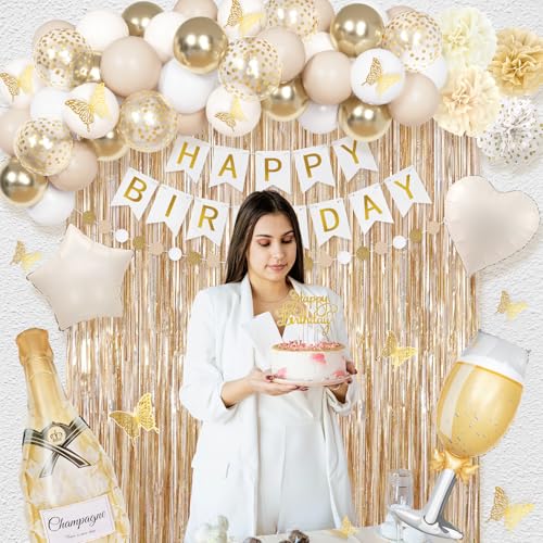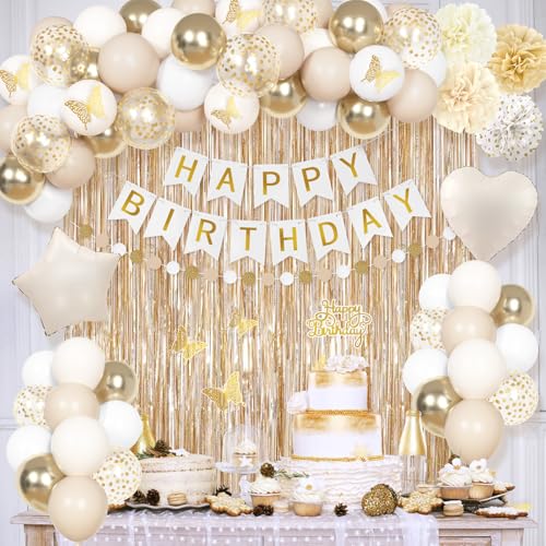 Ouddy Life White Gold Birthday Party Decorations Kit for Women Girls, Happy Birthday Banner, Sand White Metallic Gold Foil Confetti Balloons, Fringe Curtain, Cake Topper, Pompoms, Butterfly Supplies