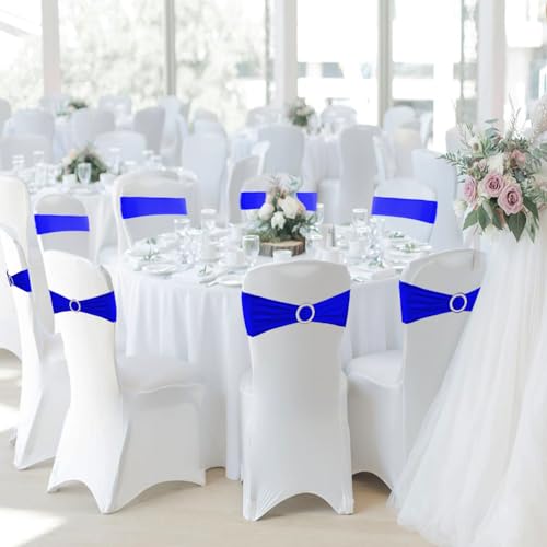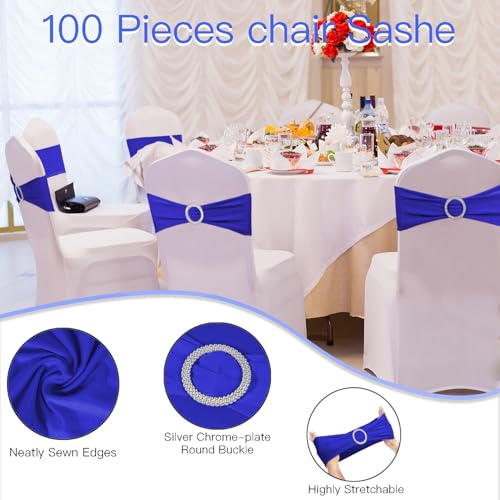 100PCS Spandex Stretch Chair Sashes Bows Elastic Chair Cover Bands Ties with Buckle Slider for Wedding Party Reception Events Universal Ceremony Banquet Decorations(Royal Blue)