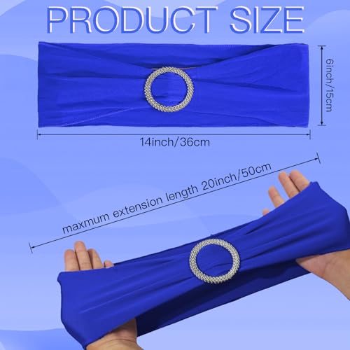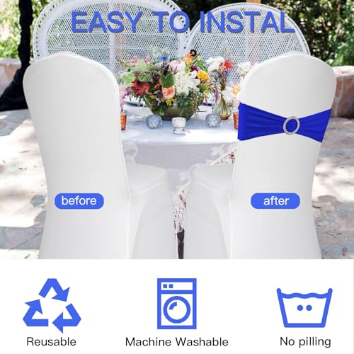 Specification: 100PCS Spandex Stretch Chair Sashes Bows Elastic Chair Cover Bands Ties with Buckle Slider for Wedding Party Reception Events Universal Ceremony Banquet Decorations(Royal Blue)
