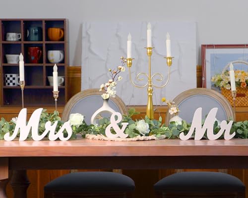 Wedding Table Decorations: the wedding decorations set includes a garland with 10 white roses and lots of white flower and a set of white Mr Mrs signs, which are suitable as Mr Mrs wedding table signs and wedding sweetheart table decorations