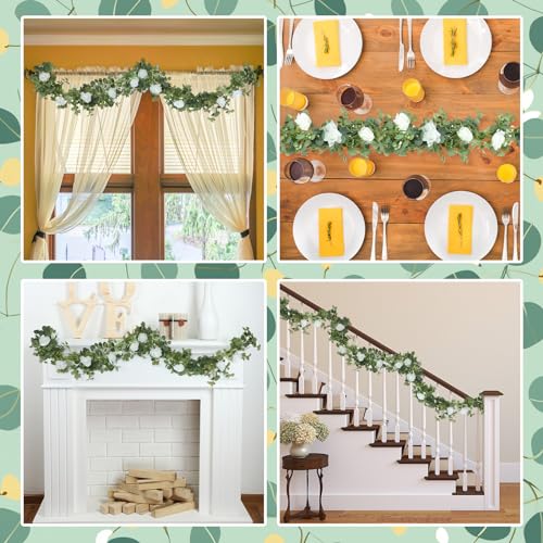 Faux Floral Garland Greenery Garland: our wreaths are handmade after many steps, made of quality silk material and advanced technology; The leaves and flowers will not fall off easily; Pure white vivid roses, scattered asters, dense eucalyptus leaves, make the whole cane look more real and beautiful; The canes are not vertical, but have a natural curvature; Make it easy to enjoy the beauty of nature