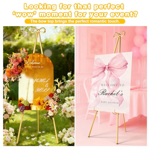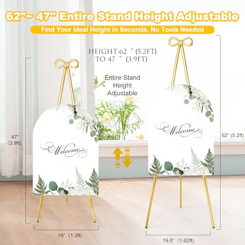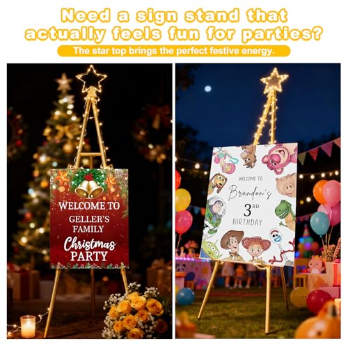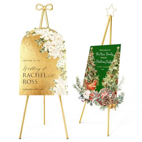Specification: Interchangeable Bow & Star Top Gold Easel Stand for Sign, 62″–47″ Height Adjustable Heavy Duty Wedding Easel Stand with 3 Display Modes — Perfect for Welcome Signs, Christmas Decor, Parties & Events
