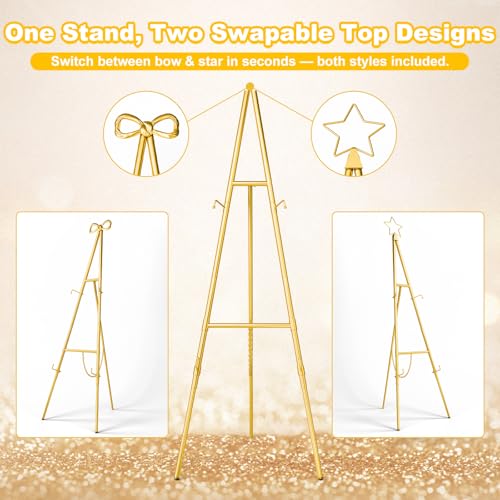 Interchangeable Bow & Star Top Gold Easel Stand for Sign, 62″–47″ Height Adjustable Heavy Duty Wedding Easel Stand with 3 Display Modes — Perfect for Welcome Signs, Christmas Decor, Parties & Events