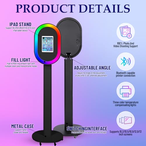Specification: Photo Booth for iPad 10.2” 10.5” 10.9″ 11″ 12.9″ 13″ Shell Stand Selfie Station Customized Logo Photobooth Machine with Beauty RGB Ring Light and Honeycomb Box for Events Wedding Parties
