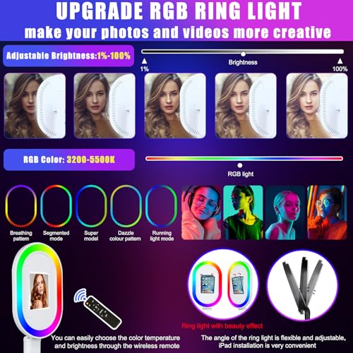 【RGB Ring Light with Beauty Effect】 The Portable iPad Photo Booth is equipped with RGB ring light, 20+ color lighting modes, each lighting mode have 1%-100% adjustable brightness to choose. You can easily choose the color temperature (2700K-6500K) and brightness (0%-100%) you want through the wireless remote control, which is very convenient. And the ring light holder has two angle adjustment methods, it is easy to find the desired shooting angle.