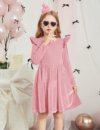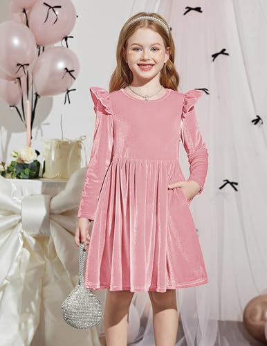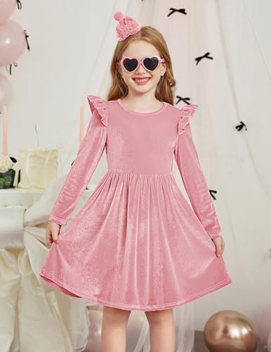 Arshiner Toddler Velvet Dress Little Girls Fall Winter Long Sleeve Ruffle Holiday Birthday Party Dresses with Pockets