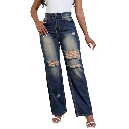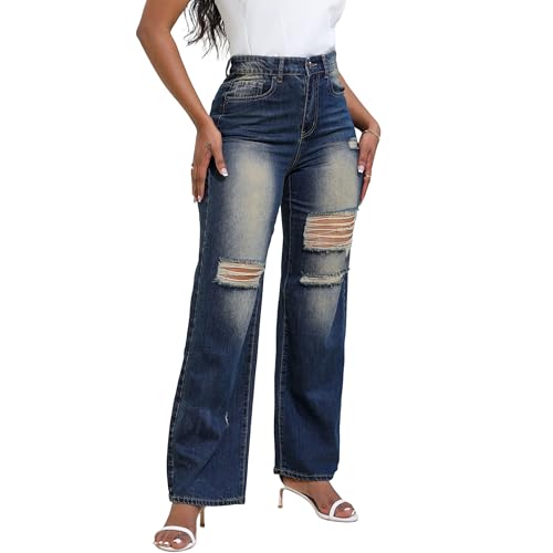 Specification: THUNDER STAR Womens High Waisted Wide Leg Jeans Stretchy Distressed Denim Pants