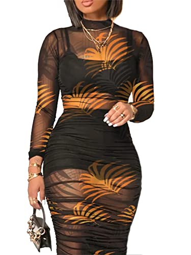 Women Sexy 3 Piece Outfits Set See Through Print Long Sleeve Midi Dress Sheer Mesh Crop Tank Tops Bodycon Skirt