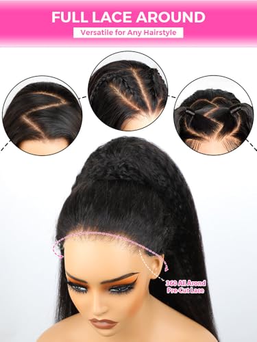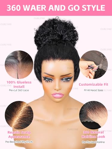 360 Curlyme Full Lace Front Wigs Human Hair Invisible Strap Pre Plucked Bleached Knots Pre Cut Skin Lace Kinky Straight Lace Frontal Wig Natural Hairline 360 Drawstring Glueless Wigs 18 Inch