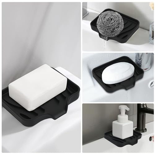 2 Pack Silicone Soap Dish with Drain, Bar Soap Holder for Shower,Bathroom and Kitchen Sink Organizer,Self Draining Waterfall Soap Tray (Black)