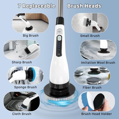 Electric Spin Scrubber, Cordless Cleaning Brush, Shower Scrubber with 7 Replaceable Brush, 2 Speeds and Adjustable Extension Handle for Bathroom Shower Bathtub Glass Car(White)