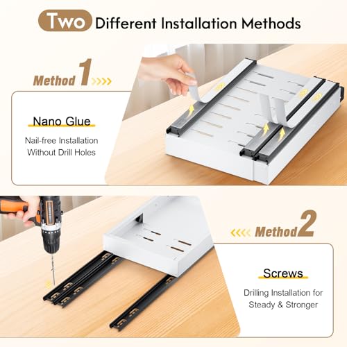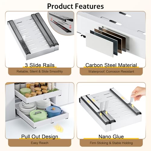 【Easy Installation and No Drilling Required】: The expandable cabinet drawers slide out offers Nano-adhesive installation for a no-drill setup or screw-in installation for added stability. Just simply peel off the protective film on the rails, place the pullout cabinet organizer with adhesive into the cabinet and press to complete the installation.