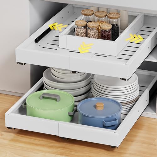 【Pull Out Cabinet Organizer】:Made from high temperature painted carbon steel, multi-layer protection against rust, ensuring long-lasting durability and strength for heavy kitchen items. Transform your space with our slide out shelves for kitchen cabinets to experience smart spaces, graceful living. Perfect for kitchen cabinets, pantries, bathroom cabinet, office cabinets, wardrobes, closets, file cabinet and other deep cabinets etc.