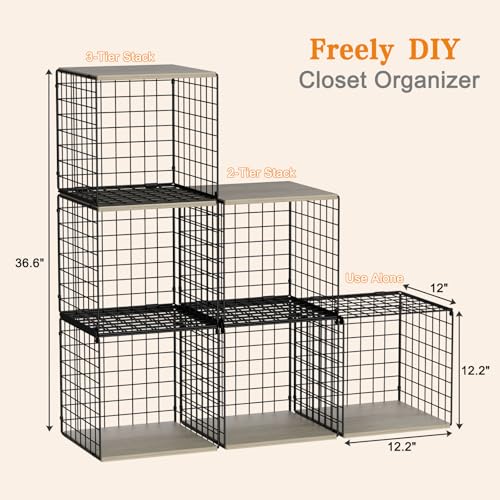 【𝗦𝘁𝗮𝗰𝗸𝗮𝗯𝗹𝗲 & 𝗦𝗽𝗮𝗰𝗲-𝗦𝗮𝘃𝗶𝗻𝗴】: These cube organizer shelf let you stack multiple units or use them individually to suit your needs, and not sliding. Use the shelf organizer basket bottom for storage clothes like sweaters jeans ttshirts ,purse organizer for closet,and the sturdy wooden top for bags, hats, or decor, giving you double the storage space in a neat, compact setup.