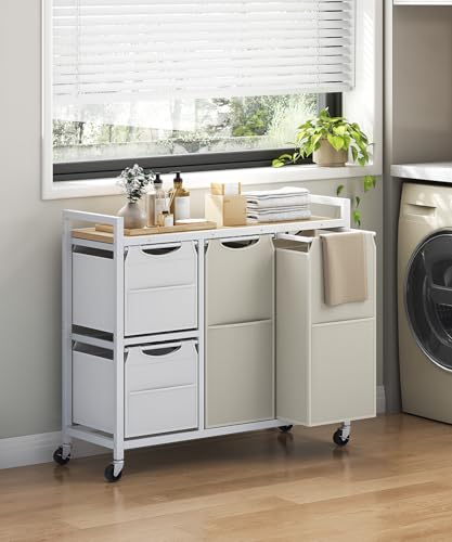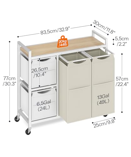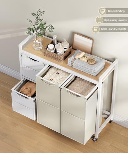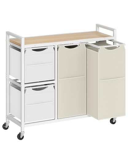 HOOBRO Laundry Sorter with 4 Section, 39 Gal. (147 L) Laundry Hamper with Wheels, Rolling Laundry Basket with Shelves, Pull-Out Detachable Bags, Side Pockets, White, Natural and Beige WNE14XY01N1