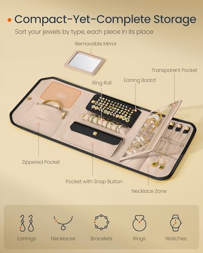 SONGMICS HOME Travel Jewelry Case, Foldable Jewelry Organizer with Mirror, Sectioned Storage, Large Capacity, Woven Embossed PU Leather, Gift Idea, Ink Black UJBC196B01