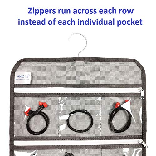 Closet hanging jewelry organizer with zippers run across each row of pockets, differ from messy jewelry boxes, keeps jewelry secure and free of dust.