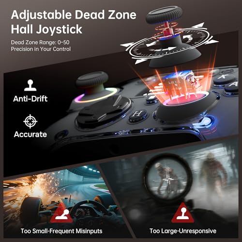🔧 Precision Hall Effect Joysticks & Dual-Stage Triggers: Featuring drift-free Hall sensors, the joysticks have a durability of up to 5 million uses and a precision deviation of less than 1%, delivering smooth and accurate control. Dead zones can be finely adjusted from 0–50% to create a personalized feel. The dual-stage trigger locks allow you to switch seamlessly between quick-fire and full-range control, perfect for FPS shooters, racing, and action games.