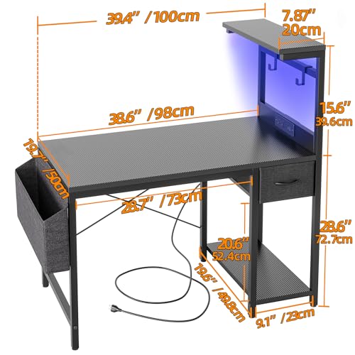 TIQLAB Gaming Desk 40 inch with Power Outlet and LED Light, Computer Desk with Reversible Shelves and Storage Drawer, Small PC Desk for Home Office Table with Bag, Carbon Fiber Black